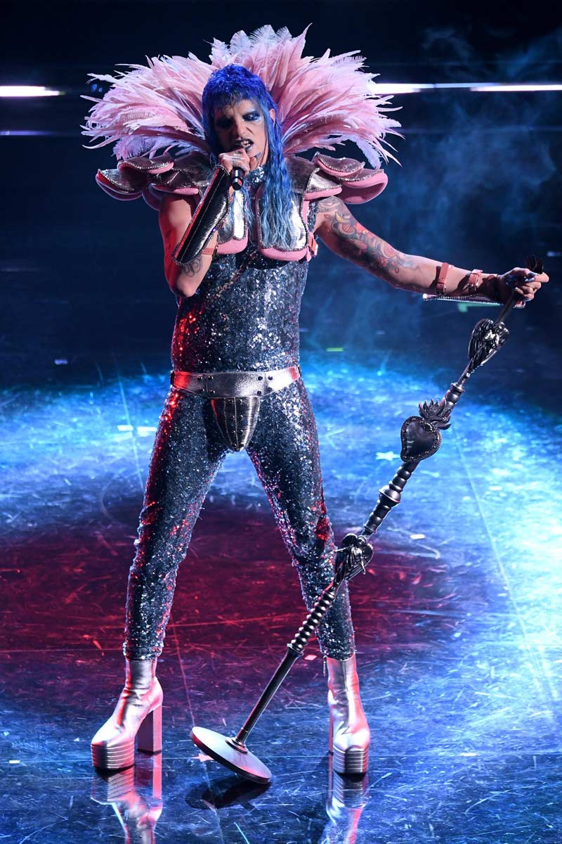 L’outfit del cantante è stato valorizzato da un’acconciatura realizzata con una parrucca bionda lunga poco sopra le spalle, ed un trucco dall’effetto argenteo in tinta realizzato su tutto il corpo del performer.