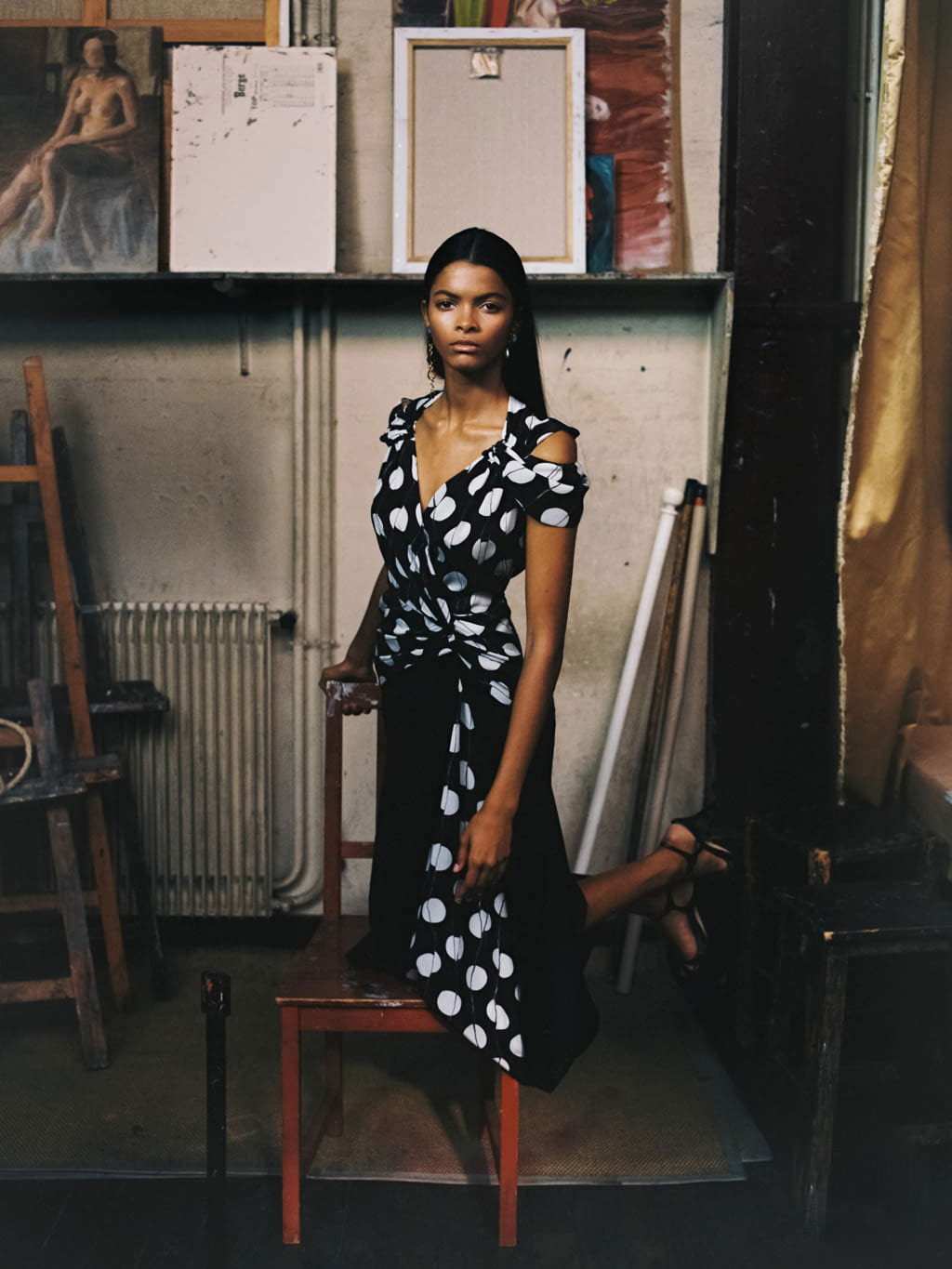 Le geometrie e le trasparenze iconiche dello stilista si uniscono alla stampa pois dando vita ad una creazione di straordinaria bellezza. I dots sono ricamati su un vestito composto da bustier e gonna. Le rouches, l’effetto vedo-non vedo e i toni del nero, rendono questo abito un connubio perfetto di romanticismo e grinta.