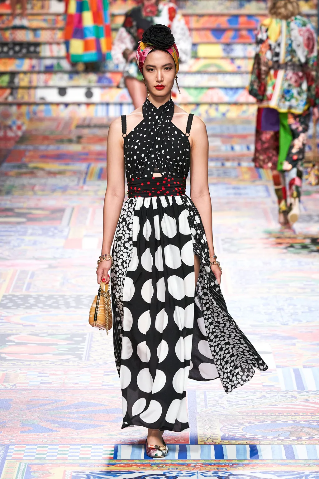 All’interno di una collezione allegra e piena di vitalità, i due stilisti hanno deciso di inserire anche i pois, declinati in diverse grandezze e prediligendo l’accoppiata nero-bianco. Gonne e abiti lunghi presentano pallini di diverse dimensioni mixati tra loro e uniti a stampe floreali colorate, creando un effetto fresco e moderno.