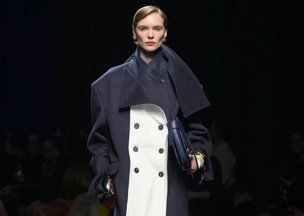 I cappotti in questa passerella scura mantengono la loro tipica rigidità strutturale, accogliendo allo stesso tempo forme inattese. Sono i tailleur a subire una rilettura audace, aprendosi ad un concetto diffuso di allusione seduttiva. Sono proprio questi dettagli candidi su tessuti corvini a creare ulteriori illusioni ottiche, evidente anche nelle décolleté affilate, spesso proposte in una veste bicolore. A bilanciare la figura intervengono borse rettangolari che mantengono una struttura architettonica rigorosa, illuminate da accessori dai bagliori metallici.