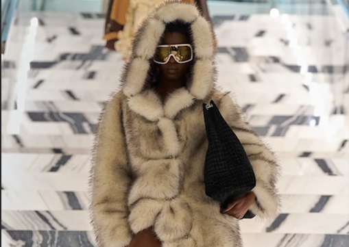 Esempio lampante è il lungo cappotto femminile dalla trama pied-de-poule marrone, arricchito da voluminosi dettagli in pelliccia sul collo e sulle ampie tasche, completato da vertiginosi stivali in pelle bordeaux. A costruzioni rigorose si alternano giacche in pelle oversize ed imponenti pellicce ecologiche candide, indossate con audacia su gambe nude e stivali cuissard neri, confermando tensione costante tra protezione ed esposizione.